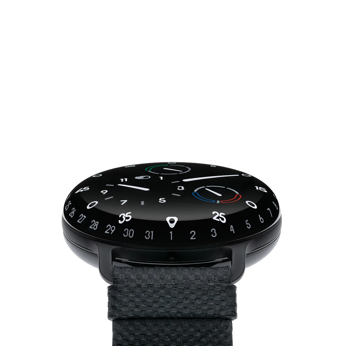 - Convex Grade 5 Titanium dial (125mm radius) with four eccentric biaxial satellites inclined at 3° (hours), 4.75° (thermal gauge and day) and 6.25° (runner)