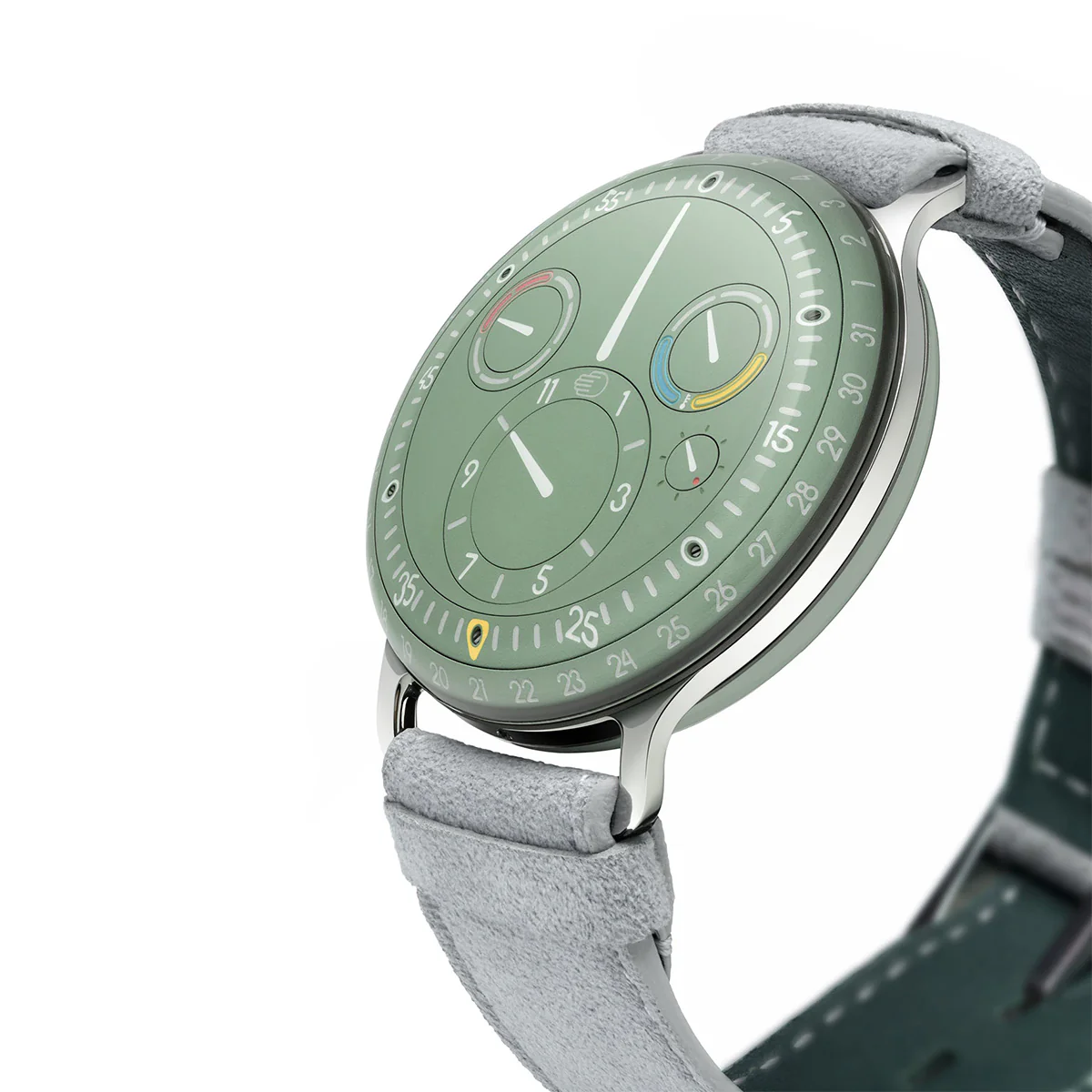 - Convex Grade 5 Titanium dial (125mm radius) with four eccentric biaxial satellites inclined at 3° (hours), 4.75° (thermal gauge and day) and 6.25° (runner)
